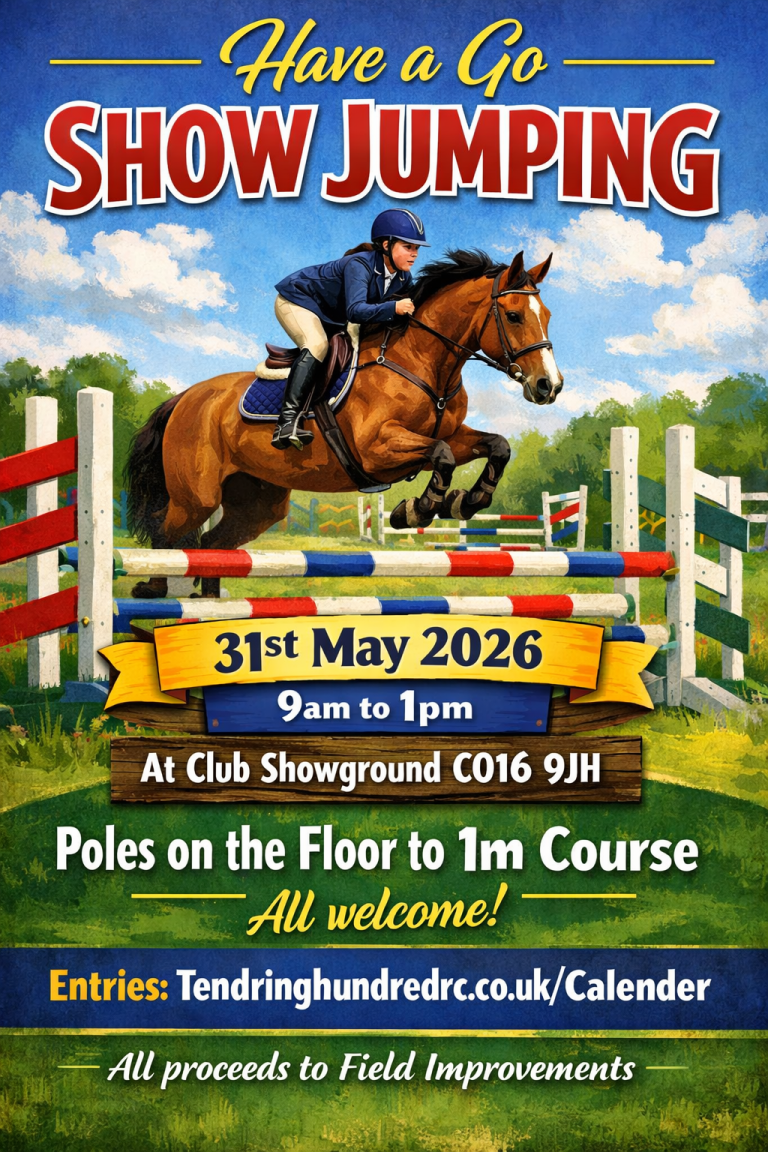 Welcome to Have a go Show Jumping morning focusing on building confidence in a friendly relaxed environment. This is not a competition. Anyone can come and have a go regardless of experience and are able to wear casual or competition clothing its entirely your choice. We will start with poles on the floor and progress up to 1m and you can enter the same class more than once if you wish.